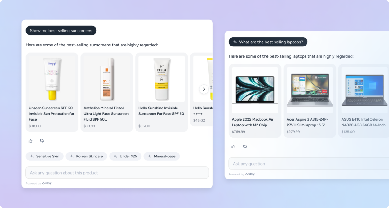 - Health and beauty: The comparison skill is crucial for health and beauty retailers. Why? Their products are the epitome of personalization, designed to look and react differently to every individual shopper. Someone with normal skin has vastly different needs than someone whose skin is more sensitive. alby’s AI shopping agent compares options to help shoppers find exactly what their skin needs.