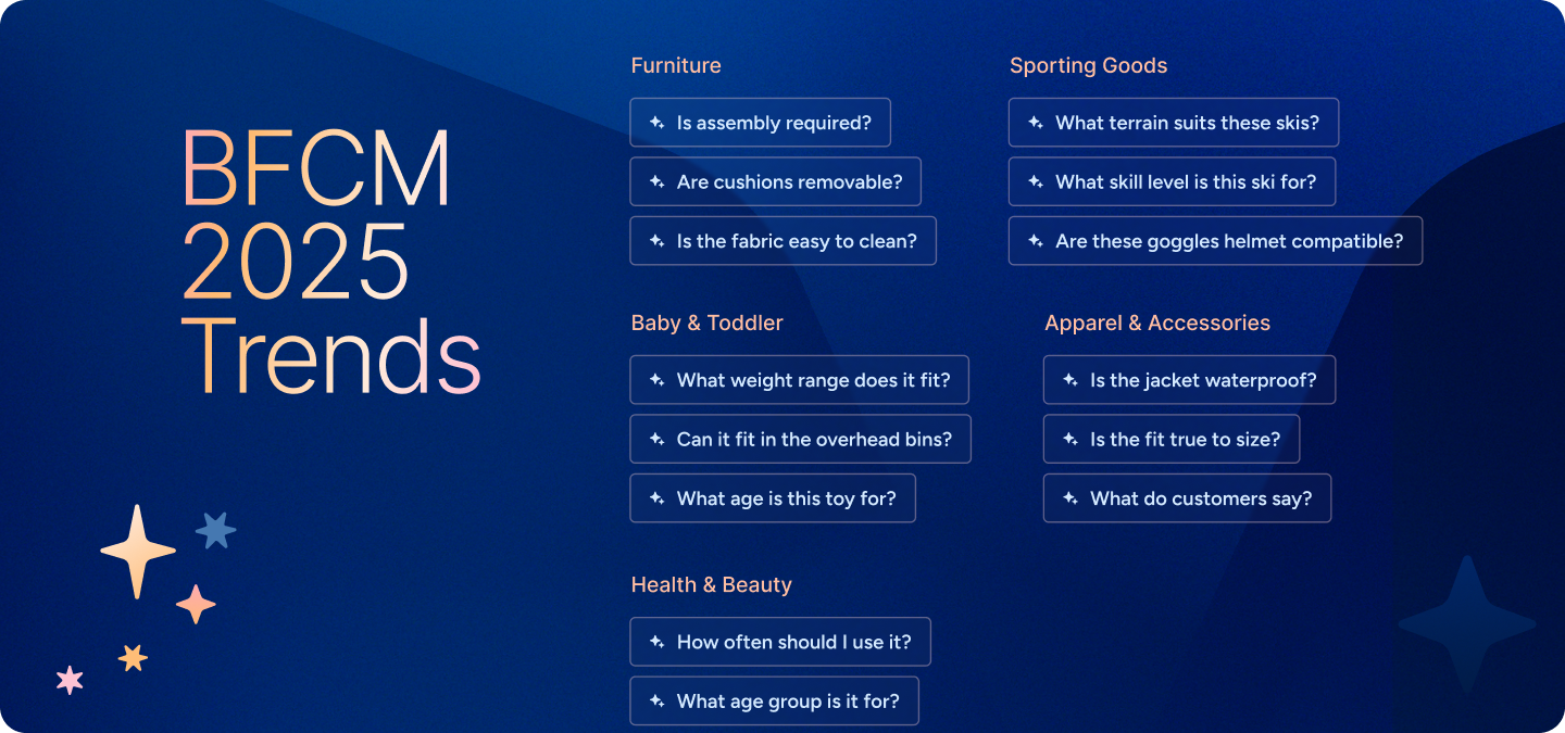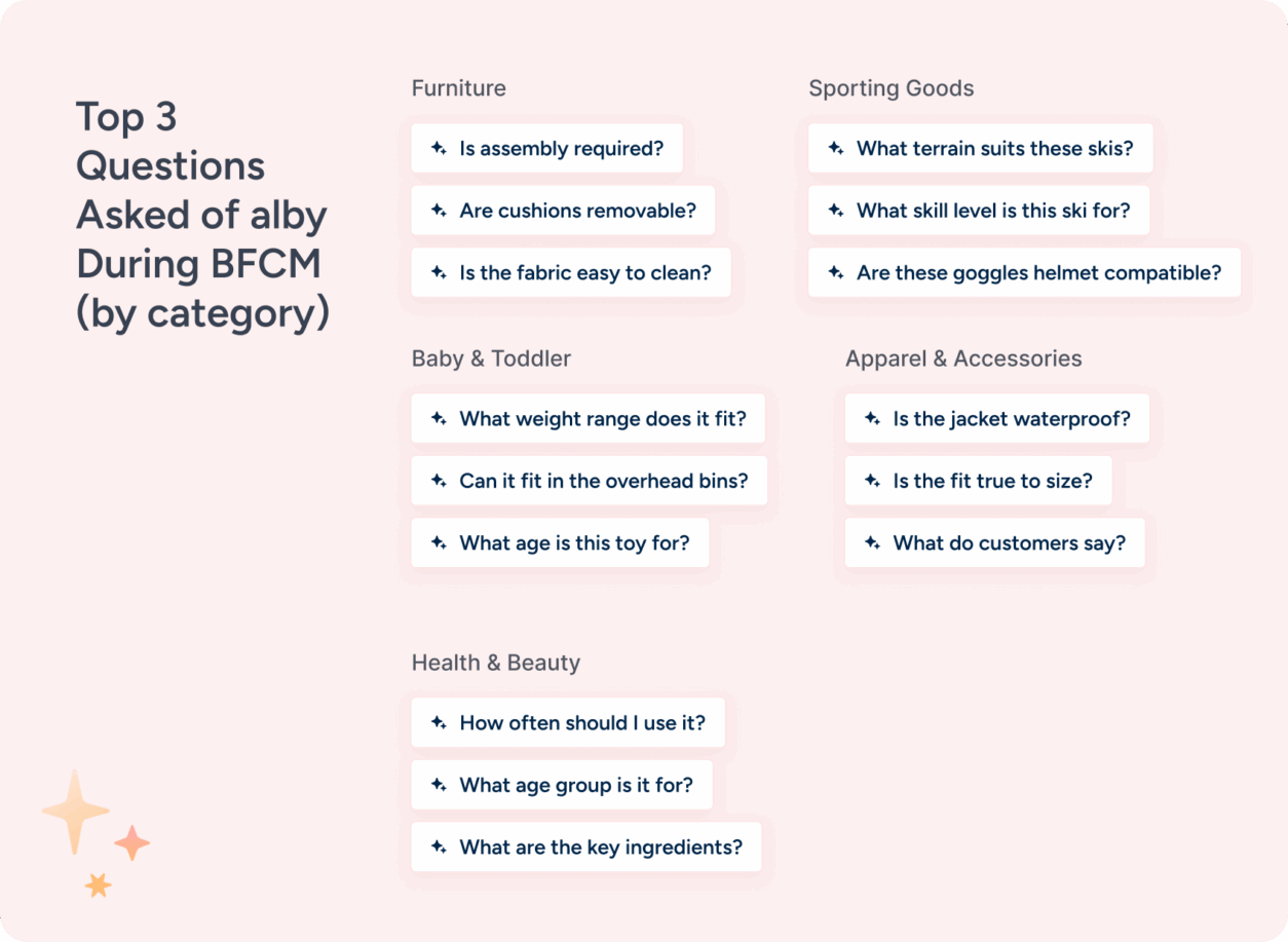 What shoppers asked alby during BFCM reveals something powerful: AI is now the first place consumers turn for the nuanced, confidence-boosting details they need before buying. Across every vertical, shoppers leaned on AI to resolve the exact friction points that typically stall purchases online: fit, safety, performance, setup, quality, and compatibility. Here are some of the themes we saw across categories: