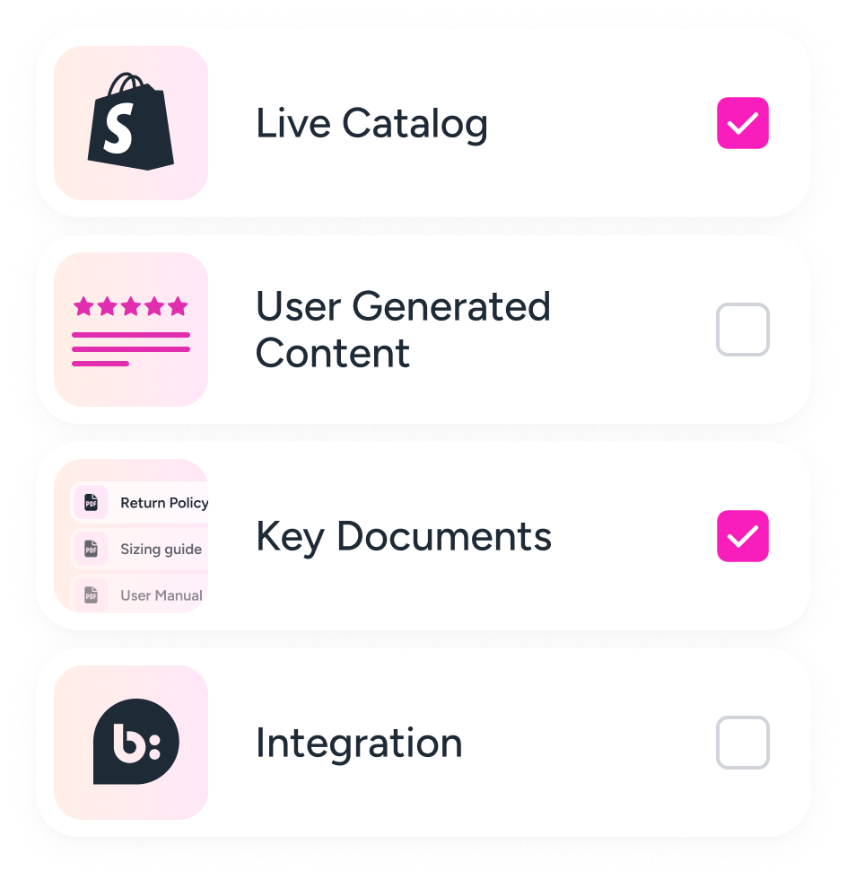 Our system ingests structured and unstructured data—product catalogs, documents, customer reviews, and more—to deliver the right information to shoppers at the right time.